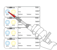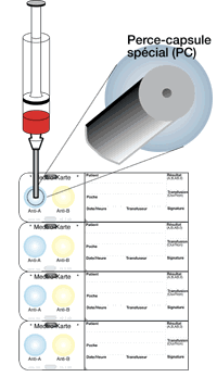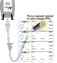 Aspirez le sang avec une pipette ou une séringue et introduisez léchantillon de sang en perforant la pellicule transparente de la capsule à l'aide de la pointe de la pipette ou de notre Perce-capsule spécial (PC); celui-ci est épointé et donc sans danger de blessure. Déposez une goutte de sang dans chaque capsule dune rangée.